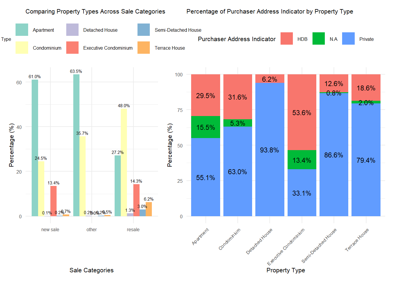 - In the new sale market, apartments represent 61% of sales, while condominiums make up 24.5%. In contrast, the resale market sees condominiums accounting for 48% and apartments at 27.2%. Detached, semi-detached, and terrace houses are less prevalent in both markets. This is attributed to land scarcity and high construction costs imposed by the Singapore government. Furthermore, many property owners retain these types of properties due to their freehold tenure.