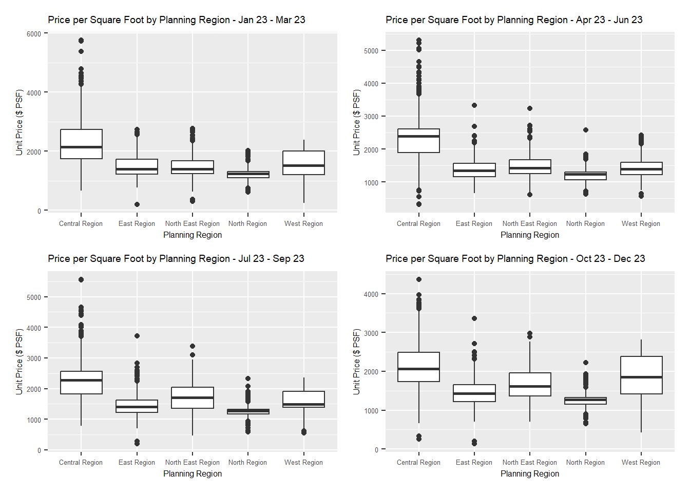 We analyzed unit price ($PSF) across Singapore’s planning regions for 2023, using four quarterly charts to visualize regional price variations. The Central Region consistently showed the highest median PSF, indicating its premium status. In contrast, the North East and East Regions maintained stable PSF values, balancing affordability with location.